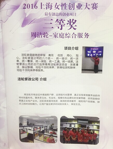 大赛启动以来反响热烈,全市共收到创业方案和创业项目149个, 大赛组委会从方案的创新性、可行性、持续性、发展性、执行力五大维度切入,经过初赛甄选、复赛评选,40个优秀创业方案、创业项目脱颖而出。在2016上海市女性创业大赛成果展中爱君家政连锁集团旗下品牌“周洁轮”荣获三等奖!
