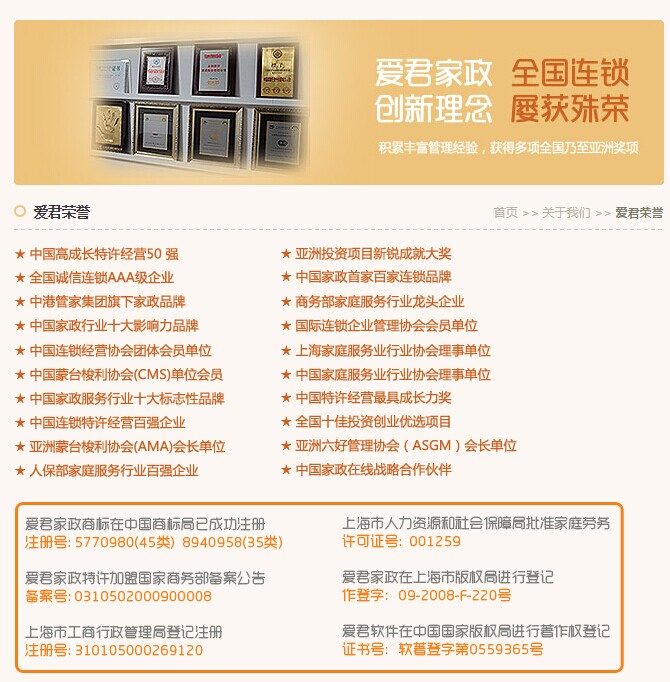 爱君品牌自2000年成立以来,全国连锁有500多家,是目前中国覆盖城市最多、分店连锁数量最多的品牌家政,获得商务部特许备案等数十种国家荣誉,现发现各地假冒爱君的家政店频频出现,特此声明,凡是爱君门店均在爱君官网www.51baomu.net有显示认证,如没有即假冒,欢迎大家打假,一旦提供有利线索,请与我联系,我们会根据商标法进行清理,如总部获得赔偿给予提供线索者奖励!